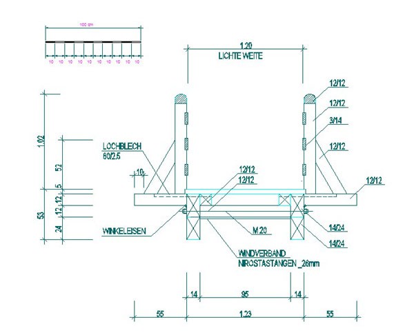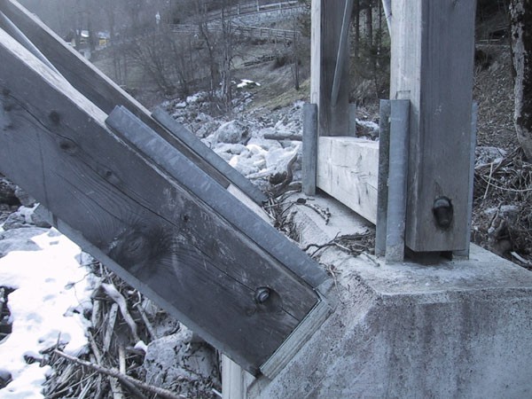 Fahrbahn: Längshölzer 12 × 12 cm, darauf Lärchenbohlen 20 × 4,5 cm