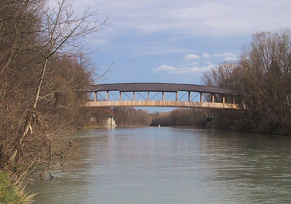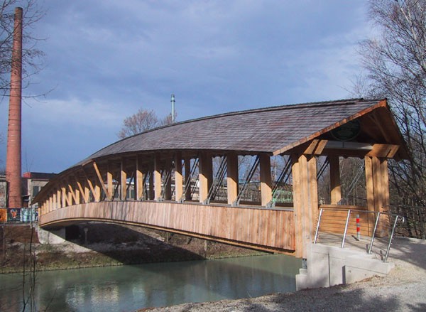 Zum Ende des 2. Weltkrieges wurde die ehemalige Brücke über die Saalach zwischen Wals-Siezenheim (A) und Ainring (D) zerstört. 2001 gelang es mit EU-Mitteln eine neue, völkerverbindende Fuß- und Radwegbrücke zu errichten. Sie ist dem grenzüberschreitenden Europagedanken gewidmet, der die Menschen der Regionen vereinen soll. Die Tragwerkskonstruktion könnte als exzentrisches Fachwerk bezeichnet werden, da, anders als bei einer klassischen Fachwerkskonstruktion, die Untergurte auch Biegemomente aufnehmen müssen. Diese resultieren aus dem großen Querschnitt des Untergurts sowie aus der bogenförmigen Überhöhung von 150 cm. Wegen Hochwassergefährdung wurde eine Strompfeilerfreie Konstruktion gewählt, die sich über knapp 70 m erstreckt und so in Europa zu den Holzbrücken mit den längsten Spannweiten zählt. Gesamtkosten: ca. € 764.700 Brückenklasse: Fußgänger-Radwegbrücke Klasse I