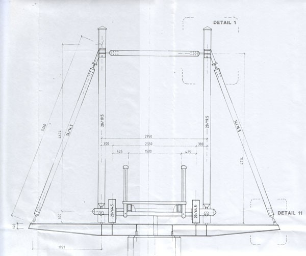 Dreifeldträger - Primäres Tragsystem: Längsträger BSH Fichte 20 x 64,5 cm, Abspannung: Stützenpaare BSH Fichte 20 x 22 cm