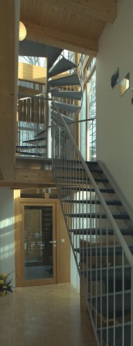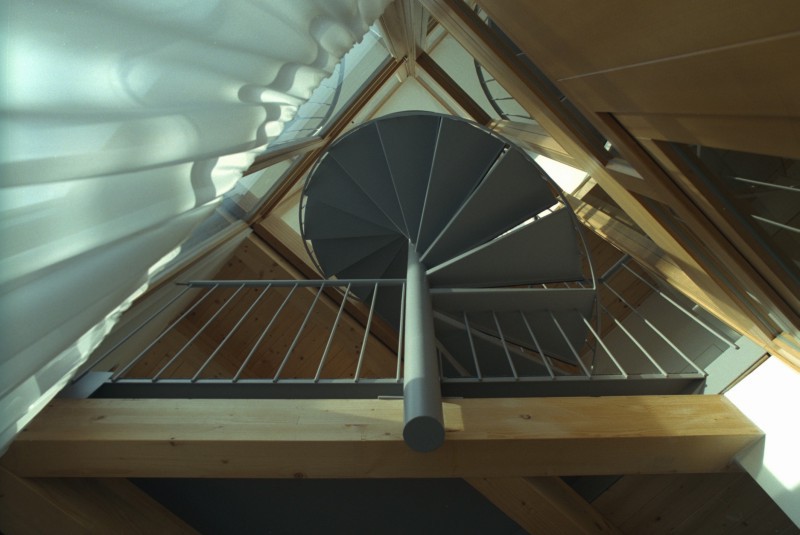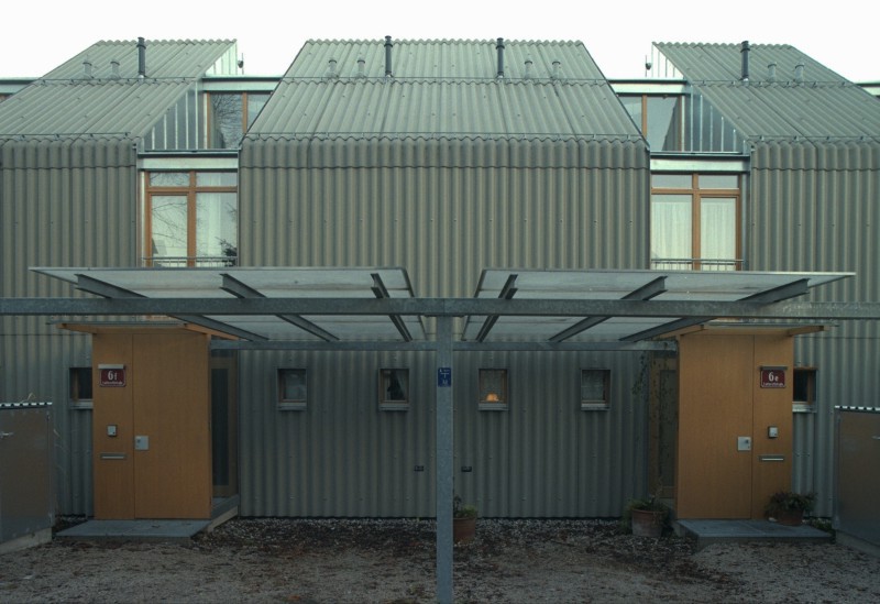 Dieses Objekt zeigt eine der ersten Reihenhausanlagen in Holzbauweise in Innsbruck. Das Dach und die Fassade sind mit Welleternitplatten wartungsfrei verkleidet, die schalltechnische Entkopplung der Gebäude untereinander gewährleistet eine doppelschalige Trennwand mit versetzten Stehern. Die beiden Ecktypen sind als Enegiespargebäude, die beiden Mitteltypen als Niedrigenergiegebäude ausgeführt.