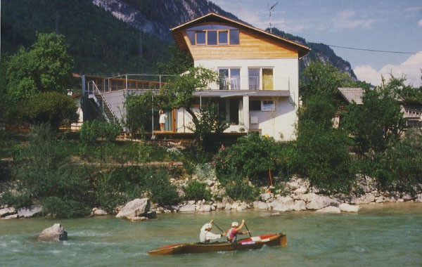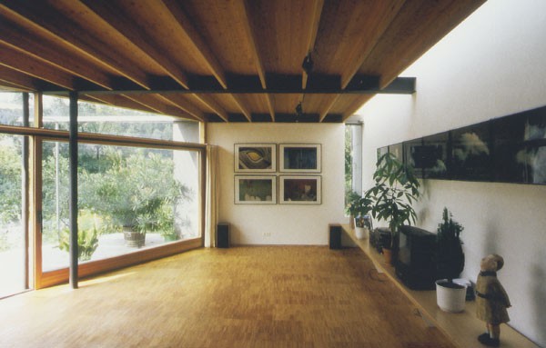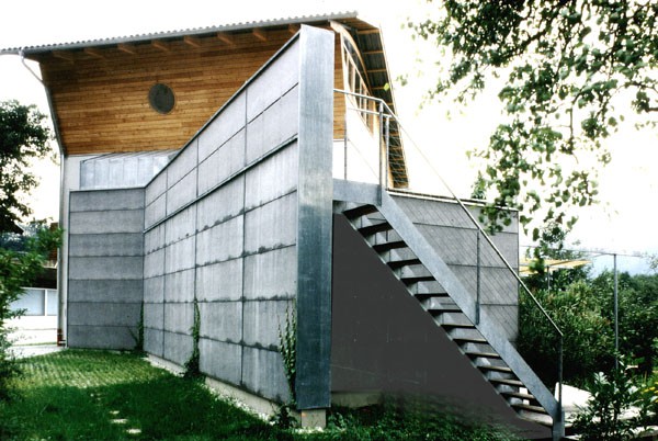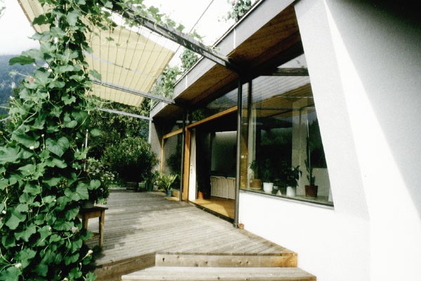 Das Einfamilienhaus D./M. liegt auf einem winzigen Grundstück an der Brandenburger Ache. Der Zubau an das alte Haus aus den 60igern besteht aus einer Konstruktion aus Stahlstützen, Brettschichtholzträgern und einer Betonscheibe. Die verlorene Gartenfläche wird durch die Dachterrasse des Zubaues ersetzt. Die subtile Variante des Satteldaches aus gebogenen Brettschichtholzträgern sorgt für ein eigenwilliges Raumerlebnis und zeigt einen intelligenten und heiteren Umgang mit den örtlichen Bauvorschriften.