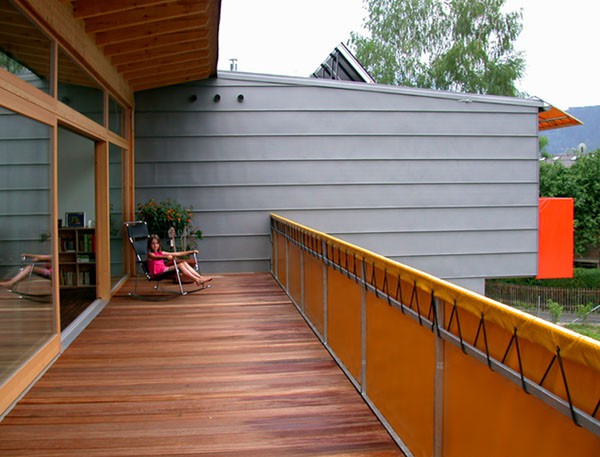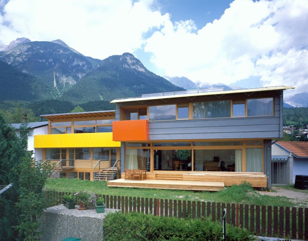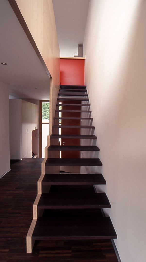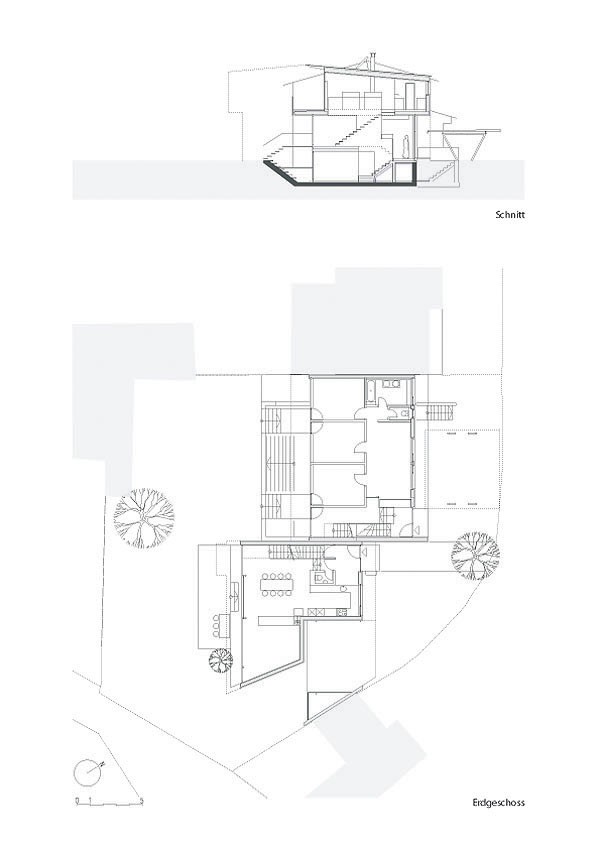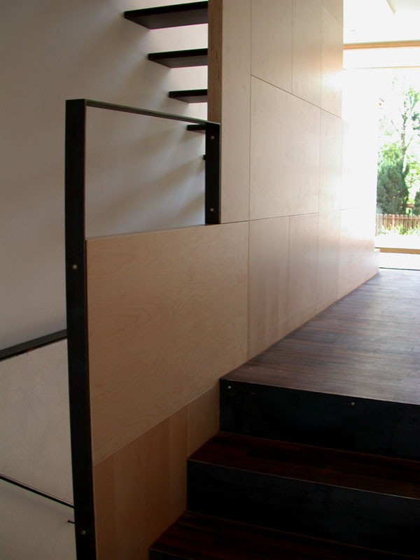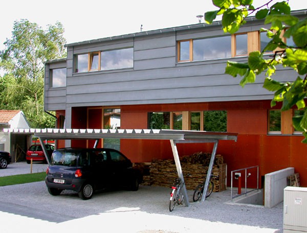 Anstelle eines mittlerweile baufällig gewordenen Hauses aus der Zwischenkriegszeit entstand auf dem nur 729m² großen Grundstück als maßvolle Nachverdichtung ein Doppelhaus für zwei Familien. Bei den individuell zugeschnittenen Haushälften wurde Holz vielseitig eingesetzt. Hervorzuheben sind die guten holzspezifischen Ansätze. Die geschützten Fassadenteile wurden mit hinterlüfteten, phenolharzbeschichteten Sperrholzplatten verkleidet, an den exponierten Stellen kam Zinkblech als Witterungsschutz zum Einsatz.