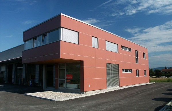 Der linear aufgefädelte Baukörper wird durch die unterschiedlichen Funktionsbereiche (Büro, Werkhalle, Unterstellhalle) optisch gegliedert. Die offene Unterstellhalle ist durch den überdachten Waschplatz mit den Werkstättenhallen verbunden. Das Bürogebäude mit den Sozialräumen, Unterkünften und Verwaltungsräumen schließt als definiertes Kopfgebäude den Baukörper ab. Durch unterschiedliche Fassadenmaterialien und Formensprache hebt sich der Büroteil bewusst vom Werkstättenbereich ab.
