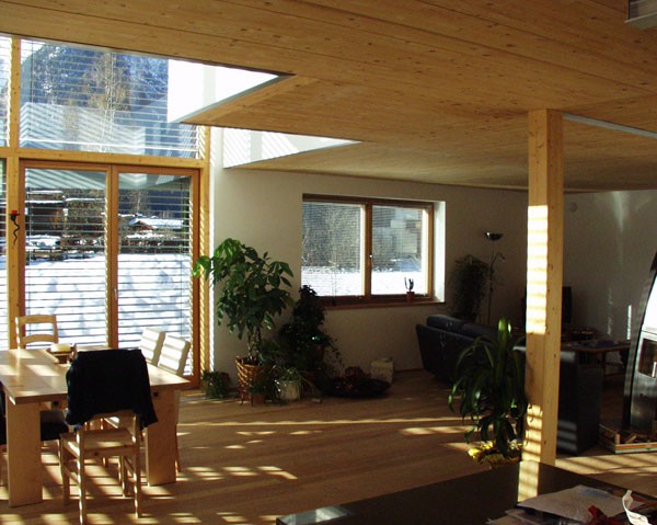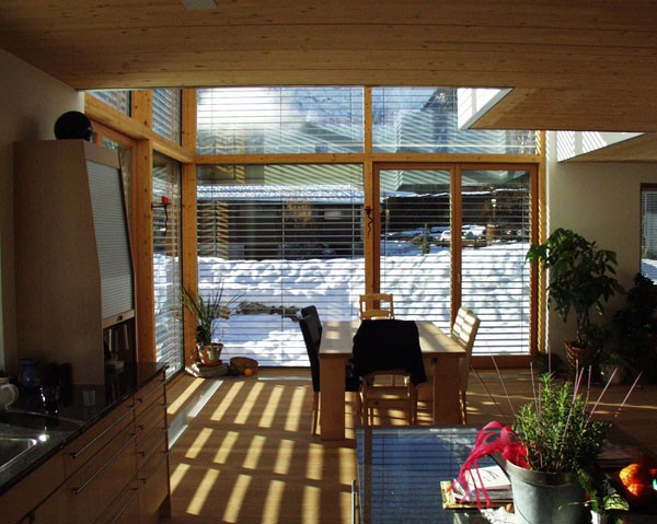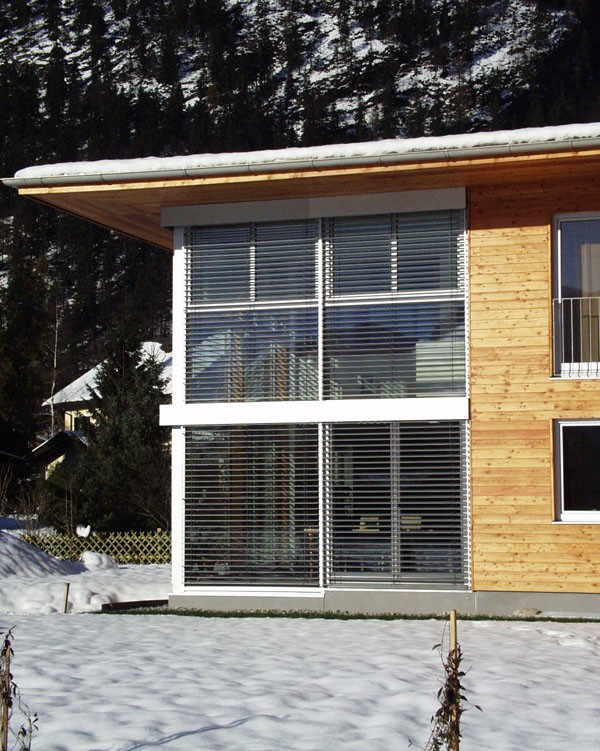 Das zweigeschossige Einfamilienhaus Stainer weist einen L-förmigen Grundriss auf. Der Wohnraum im EG öffnet sich im Essbereich zu einem zweigeschossigen Raumerlebnis. Das Walmdach ist 5° geneigt.