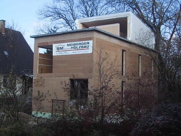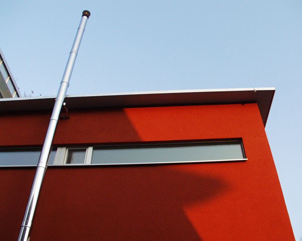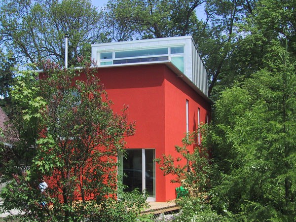 Das Wohnhaus besteht aus einem schmalen länglichen Baukörper über 2 Vollgeschossen und einem Dachgeschoss. Charakteristisch für das Haus ist der Putz auf den beiden Vollgeschossen und die Uginox Verblechung des Dachgeschosses.
