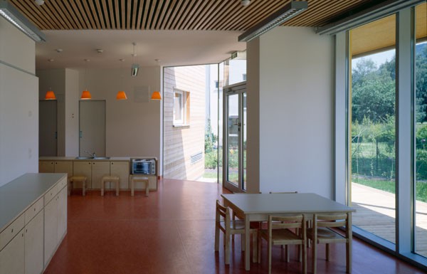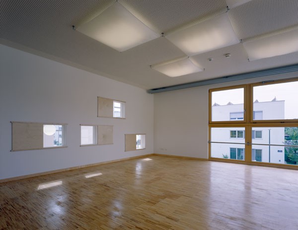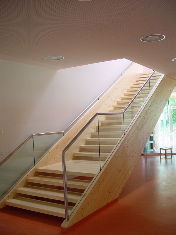 Um den Trittschall optimal in Griff zu bekommen, wurde die Geschossdecke in einer massiven Brettstapeldecke mit darüber liegendendem, massiven Heizestrich ausgeführt. Eine zusätzliche Schallschutzdecke aus Hartholzstäben erhöht das Schallschluckvermögen und gewährleistet angenehme akustische Bedingungen im Inneren der Gruppenräume.