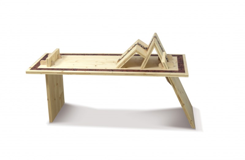 Natürlich Natur! Bodenständiger Couchtisch mit edlem, farbintensivem Intarsien-Streifen aus heimischer Rinde - hier auf Dreischicht-Holzplatte mit aufgestecktem Bergemblem (Intarsie aus wurmzerfressenem Astling). Andere (helle) Hölzer und jedes gewünschte Maß möglich. Einzelteile nur ineinandergesteckt und gekeilt. Kein Nagel, keine Schraube! Oberflächen geölt. Alles Handarbeit. Lieferung erfolgt flach, inklusive Werkzeug, das heißt in diesem Fall mit wurmzerfressenem Spezialhammer "Hau drau". Aufbau in kaum einer Minute.