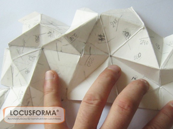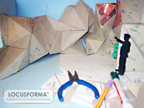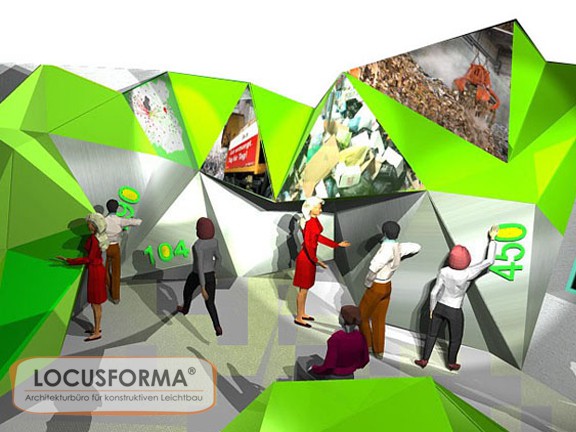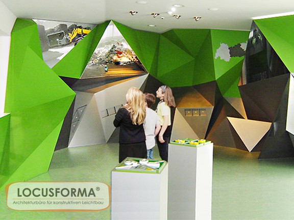 Für das Besucherzentrum der Abfallsortieranlage Ahrental/ Innsbruck wurde einer der Schauräume mit einer 3D - Fassade gestaltet. Die interaktive Schauwand symbolisiert mit ihrer bizarren Struktur einen Müllberg und wird medial bespielt. Die Ausstellungsfassade ist ein frei stehendes Tragwerk, das aus einer ebenen Fläche heraus gefaltet wurde. Die 96 Segmente der Konstruktion bestehen aus konturgeschnittenen Holzplatten und sind ohne zusätzliche Hilfs- und Verbindungsmittel vor Ort zusammengebaut worden. Die Konstruktion ist selbsttragend - lediglich die Stirnseiten der Platten wurden zur Stabilisierung untereinander verklebt. Es ist die erste in dieser Art realisierte und öffentlich nutzbare architektonische Faltung.
