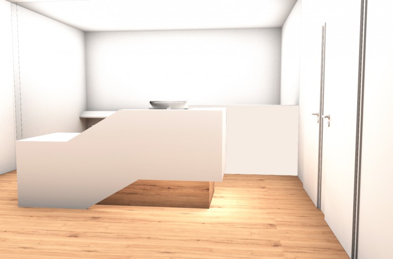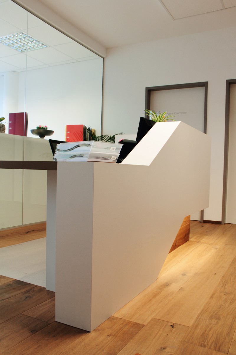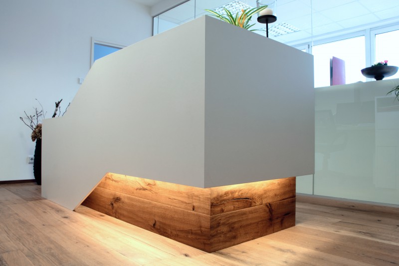 Anmeldepult für eine Kanzlei mit einem monolithisch wirkenden Körper (matt weiß), welcher schwebend über dem Grundkörper aufsteigt. Der Grundkörper ist mit zwei Schubladen und einem PC-Schrank ausgestattet. Der rustikale Eichenparkett wurde über den Grundkörper hochgezogen um eine solide und massive Wirkung zu erzielen.