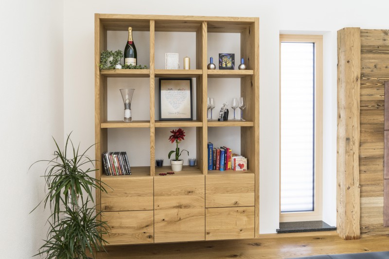 Wohnzimmer mit Wohnwand und Leseecke in sonnenverbranntem Altholz und gehackten Balken. Sideboard und Bücherregal in Eiche massiv.