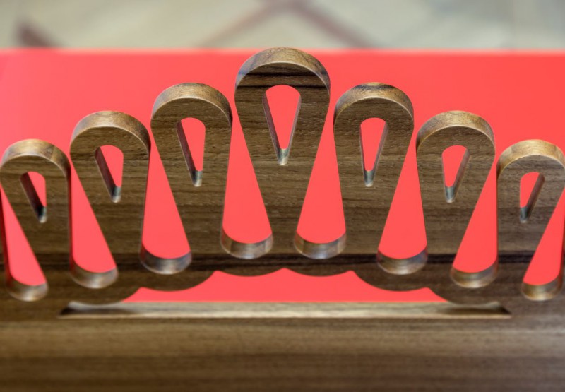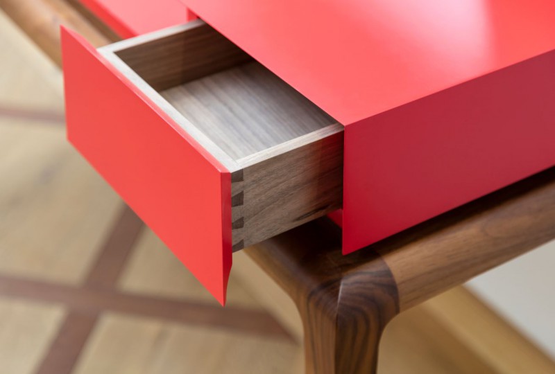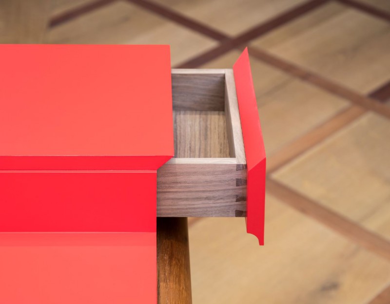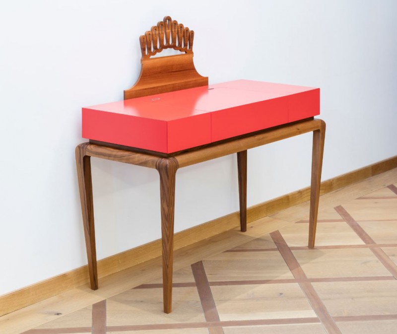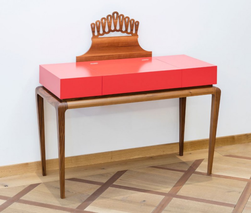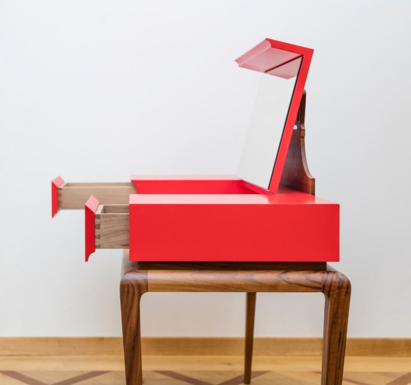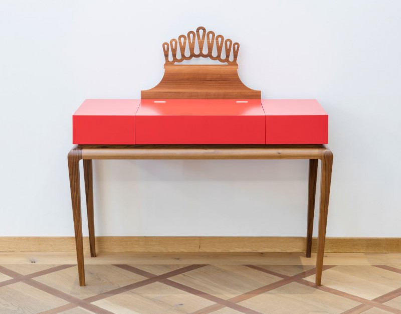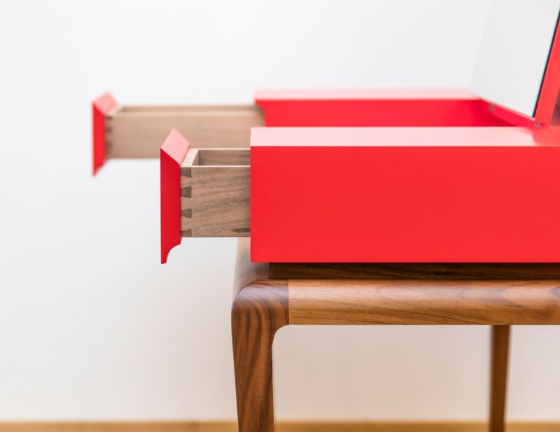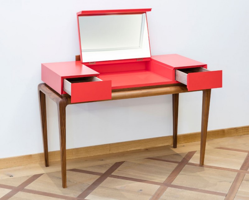 Das Gesellellenstück wird zur Lehrabschlussprüfung eines Tischlergesellen als Werkstück gemacht. Die angehenden Gesellen müssen ihr Stück während des letzten Schulbesuches eigenständig planen und entwerfen. Dieses Werkstück muss als Kriterien eine klassisch geführte Schublade handgezinkt und ein Einstemmband beinhalten. Ansonsten sind der Kreativität der angehenden Gesellen keine Grenzen gesetzt. Das Gestell für diesen außergewöhnlichen Schminktisch wurde in Nussholz mit leicht stilisierten, konischen Füßen gefertigt. Alle Nussteile sind farblos lackiert. Der rubinrote Aufsatz wurde auf einen Nussrahmen aufgesetzt und als Korpus mit zwei klassisch geführten Schubladen mit Schwalbenschwanzzinken ausgeführt. Die Fronten der Schubladen sind auf Gehrung geschnitten. Dazwischen bietet ein aufklappbarer Mittelteil Platz zur Ablage diverser Utensilien und ist an der Innenseite mit einem Spiegel ausgestattet. Zum Öffnen der Schubladen und des klappbaren Mittelteils wurden unten nicht sichtbare Griffleisten eingefräst. Als Oberfläche wurde die rote Schleiflackierung gewählt. Eine überstehende eingefalzte Rückwand in Nussholz und in Form eines stilisierten Krönchens wurde CNC gefräst und handgeputzt. Sie verleiht dem Schminktisch seinen besonderen Charme.