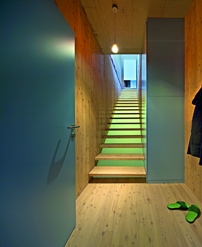 Lärchenholztreppe. Zentrales Element im Obergeschoß