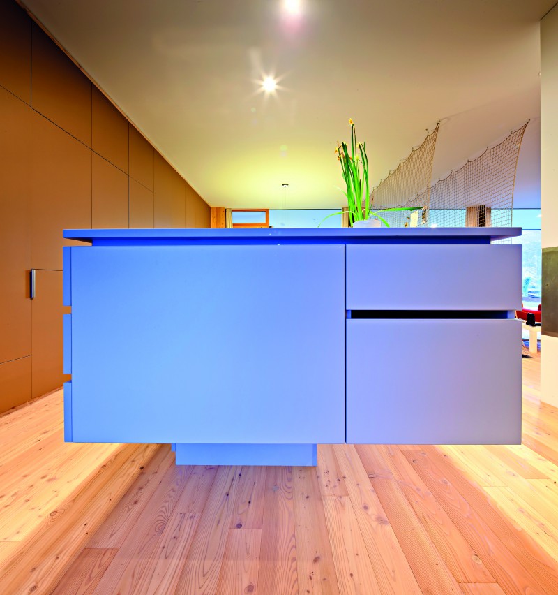 privateren Bereichen ab. Der im Raum stehende Küchenblock