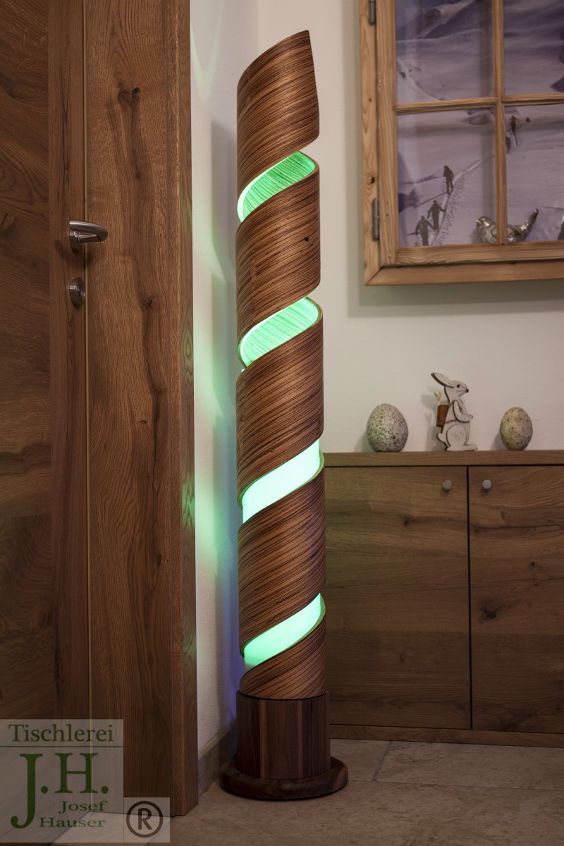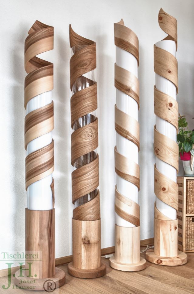 Bei der Fertigung werden Furniere ausgewählt, dann werden die einzelnen Blätter in Schichten mit Leim aufgetragen und anschließend mit einer selbst gebauten Lehre spiralförmig nach oben gewickelt und verpresst. Nach etwa 24 Stunden ist die Spirale soweit, dass sie von der Lehre genommen werden kann. Die Lampe wird in der Breite wieder in Spiralenform nach oben geschnitten und geschliffen. Der Lampensockel wird gedrechselt und für den LED Strahler vorbereitet. Die Oberfläche wird entweder naturbelassen oder geölt. Zylinder in klar, mattiert oder weißem Glas erhältlich, LED Leuchten wahlweise mit fernbedienbarem Farbwechsler.