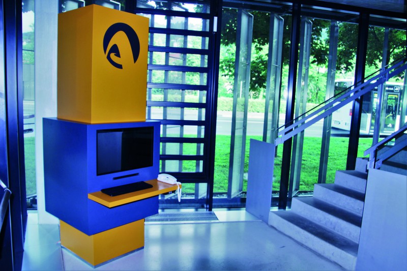 Im Infostand wurde ein Drucker, ein Touchscreen-Bildschirm, ein Rechner, der Hebemechanismus, eine Tastatur, die Sensoren für die Türen, die Bedienfläche für die Höhenverstellung und ein Telefon verbaut.