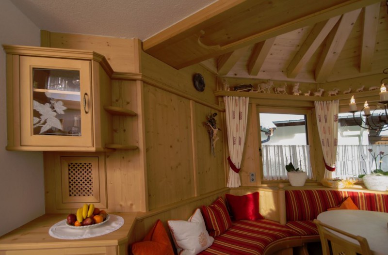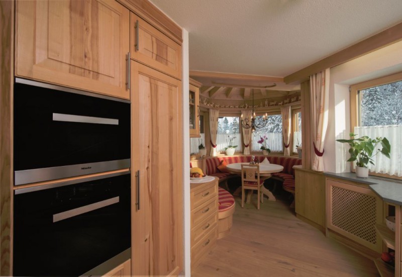 Ausführung Essbereich: in Fichte massiv, geschliffen gebeizt und mit Natureffekt Lack lackiert.