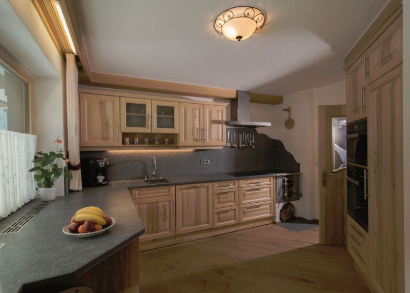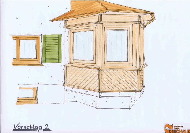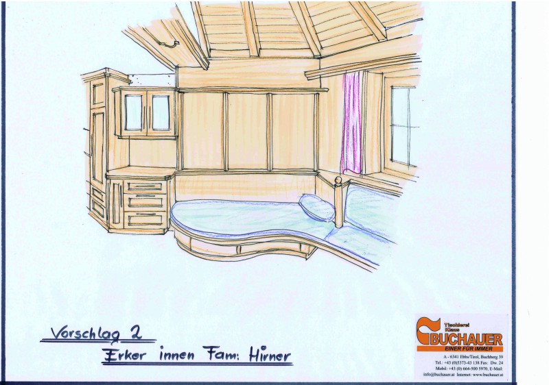 Bedingung: die Küche und besonders der Essbereich muss rustikal und gemütlich sein! Ziel und Idee unserer Planung war es nicht nur einen besseren Arbeits- und Essbereich zu gestalten, sondern auch den Raum großzügiger und freier wirken zu lassen und das beengende durch die massive Speis aufzulösen. Dazu haben wir die Ecke der Speiswand aufgebrochen und dadurch Platz für 2 Hochschränke geschaffen. Die Mauer an der Hausseite über Eck geöffnet – gerade so weit wie es statisch noch zu vertreten war und an diese Öffnung einen Erker in 8-eckiger Grundform in Holzbauweise angebaut, der als Essbereich in Stubencharakter dient. Die Dachkonstruktion ist sichtbar und wurde auf Wunsch des Bauherrn stark dimensioniert ausgeführt. Die ganzen erforderlichen Arbeiten und Professionisten für den An- und Umbau wurden von uns organisiert und koordiniert. Ausführung Küche: In Braunesche leicht gebeizt und mit PUR-Lack lackiert, Innen aus E1 Dekorspan MAX 0408 PO - Anleimer Stabilkante.