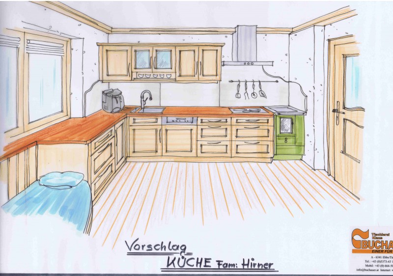 Tischlerküche – Die Rustikale! Ausgangssituation: Die Familie Hirner hat eine Küche mit Essplatz. Die Küche besteht aus einer geraden Küchenzeile ohne Hochschränke. Der Kühlschrank und viele Küchenutensilien befinden sich in der Speis (immer durch 2 Türen). Der Raum ist durch die massiv in die Küche ragende Speis sehr beengt. In der verbleibenden Ecke ist eine U-Bank eingebaut, wobei der Platz für die große Familie zu klein ist. In der Küche wird für viele Personen gekocht und auch das Catering (kalte Platten, Kuchen, Nachspeisen usw.) hergerichtet bzw. gebacken.