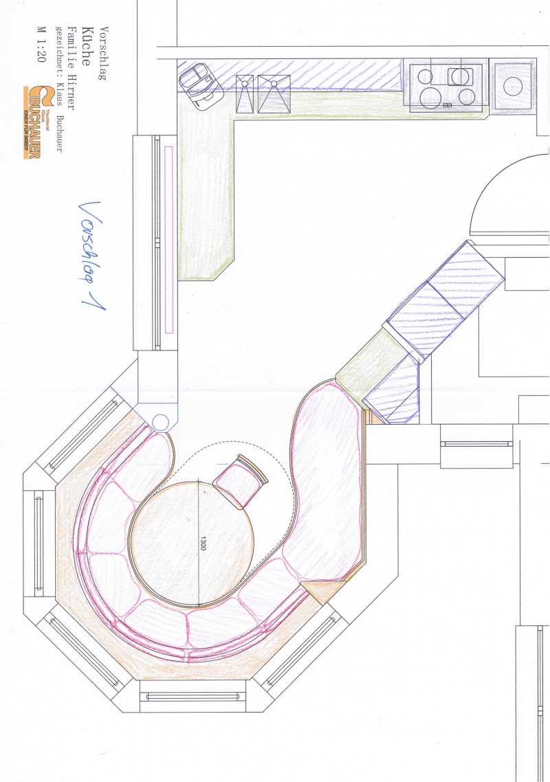 Die Küche soll praktischer werden, vor allem mehr Arbeitsfläche und der Kühlschrank soll in der Küche sein. Backrohr und Dampfgarer wünsche ich mir – hoch eingebaut wäre ideal. Ein kleiner Anbau seitlich vom Haus ist möglich. „Die Küche ist einfach zu klein, versuche bitte das Bestmögliche raus zu holen“.