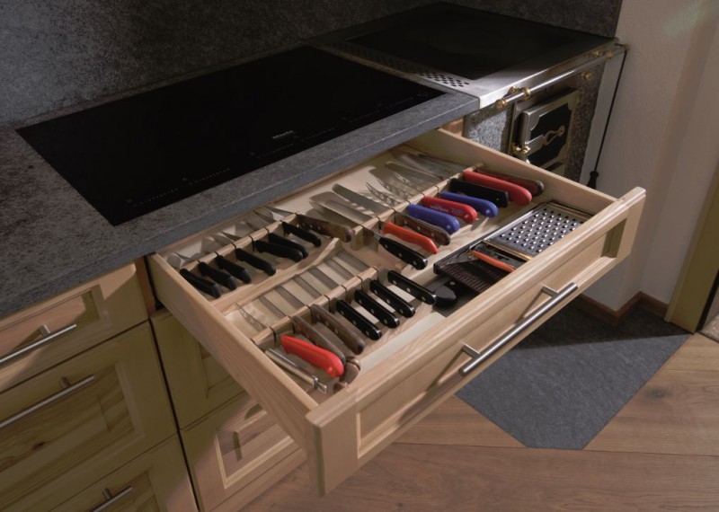 Schubladen: Aus Braunesche massiv – selber gefertigt, Unterteilungen und Inneneinteilung nach Wunsch des Kunden angefertigt mit Blum Movento Führungen.