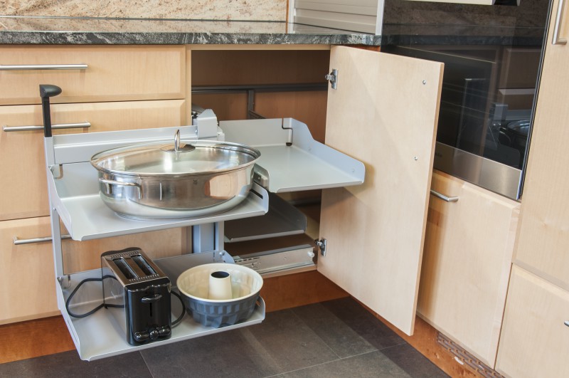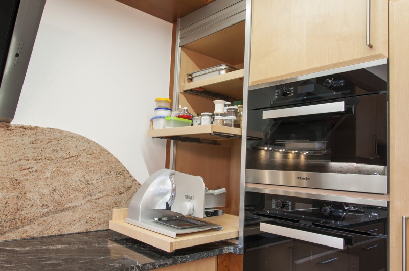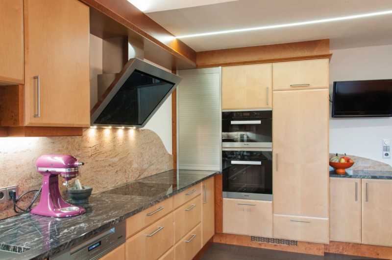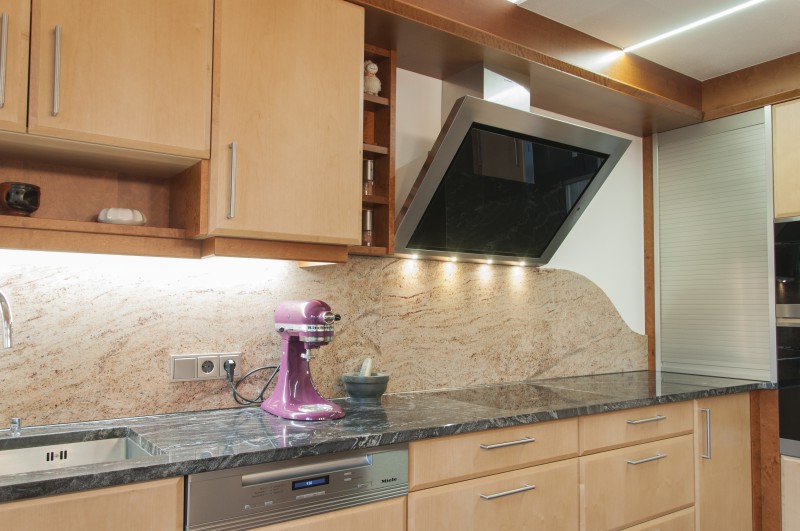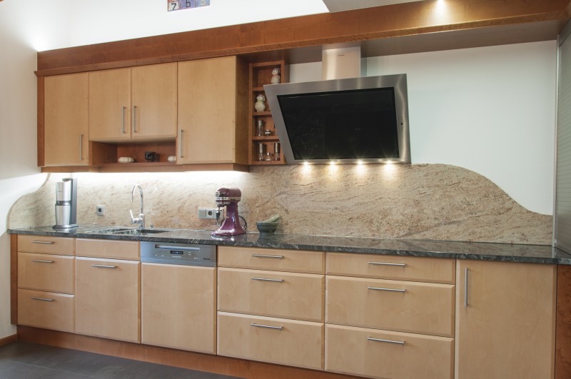 Schubladen: Aus Ahorn massiv – selber gefertigt. Unterteilungen und Inneneinteilung nach Wunsch des Kunden angefertigt und mit Blum Movento Führungen versetzt. Arbeitsplatte: Granit Black Skorpion poliert, Rückwand Granit Shivakashi poliert mit Bruchkante. Griffe: Edelstahlgriffe Modell Gehrung.