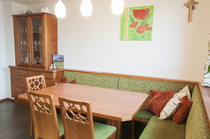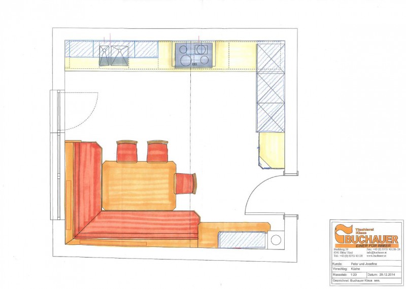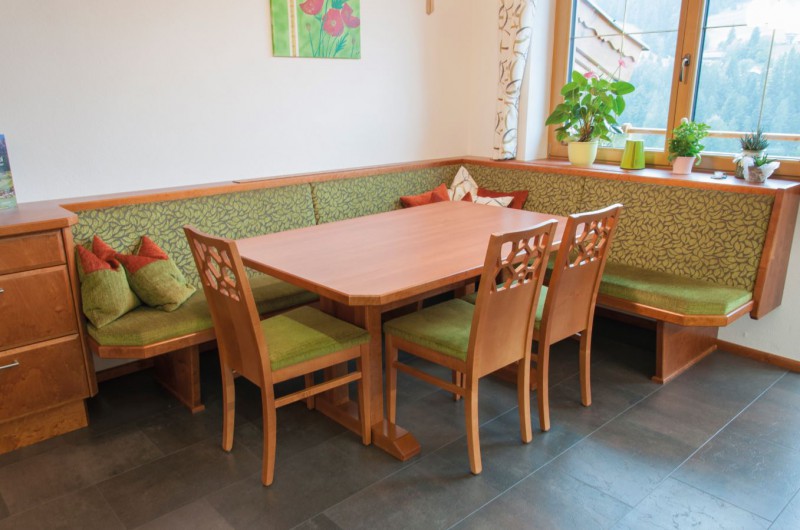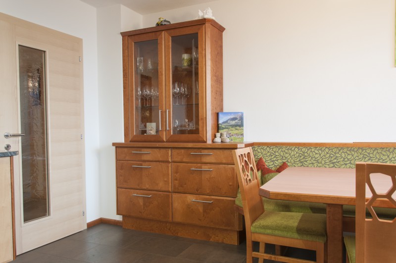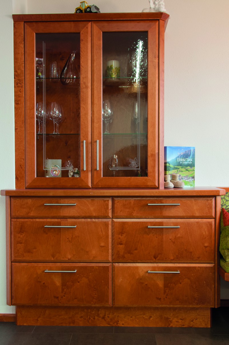 Tischlerküche – Die Gemütliche. Ausgangssituation: Bei einem Bauernhaus sollte in das Dachgeschoß eine abgeschlossene Wohnung mit eigenem Zugang errichtet werden. Wir haben dazu für die ganze Wohnung ein Grundrisskonzept erstellt. Da das Dach komplett erneuert wurde, konnten wir durch die Einplanung eines Quergiebels einen hellen, großzügigen Raum für die Küche schaffen. Wunsch des Kunden: Es soll eine Küche mit großzügigem Essbereich geschaffen werden. Die Küche soll einen warmen, wohnlichen Charakter erhalten und gut mit dem Sichtdachstuhl harmonieren, jedoch nicht rustikal sein. Die Planung: In der Planung haben wir zugunsten der großzügigen Essecke auf eine Insellösung verzichtet und eine klassische Küchenanordnung mit einer Eckverschneidung, einer Küchenzeile und einem Hochschrank gewählt. Im Bereich dieser Ecke haben wir einen Rolloschrank mit inliegenden Auszügen für die Küchenmaschine und diverserer Geräte angeordnet, um den Eckbereich optimal zu nützen. Die Essecke besteht aus einer voll gepolsterten Eckbank mit einen großen Tisch und 3 Stühlen. Seitlich davon befinden sich ein Kredenzschrank mit Auszügen für das Tischgeschirr, Besteck und darüber ein Gläserschrank für Trinkgläser und Kaffeeservice. Ausführung Küche: Glatte Fronten in Ahorn furniert mit Facette, Simse Sockel Sichtseiten in Birke dunkel gebeizt. Innenleben aus E1 Dekorspan mit Stabilkante, wasserfest aufgeleimt.