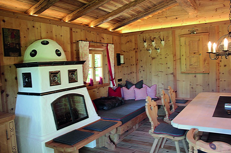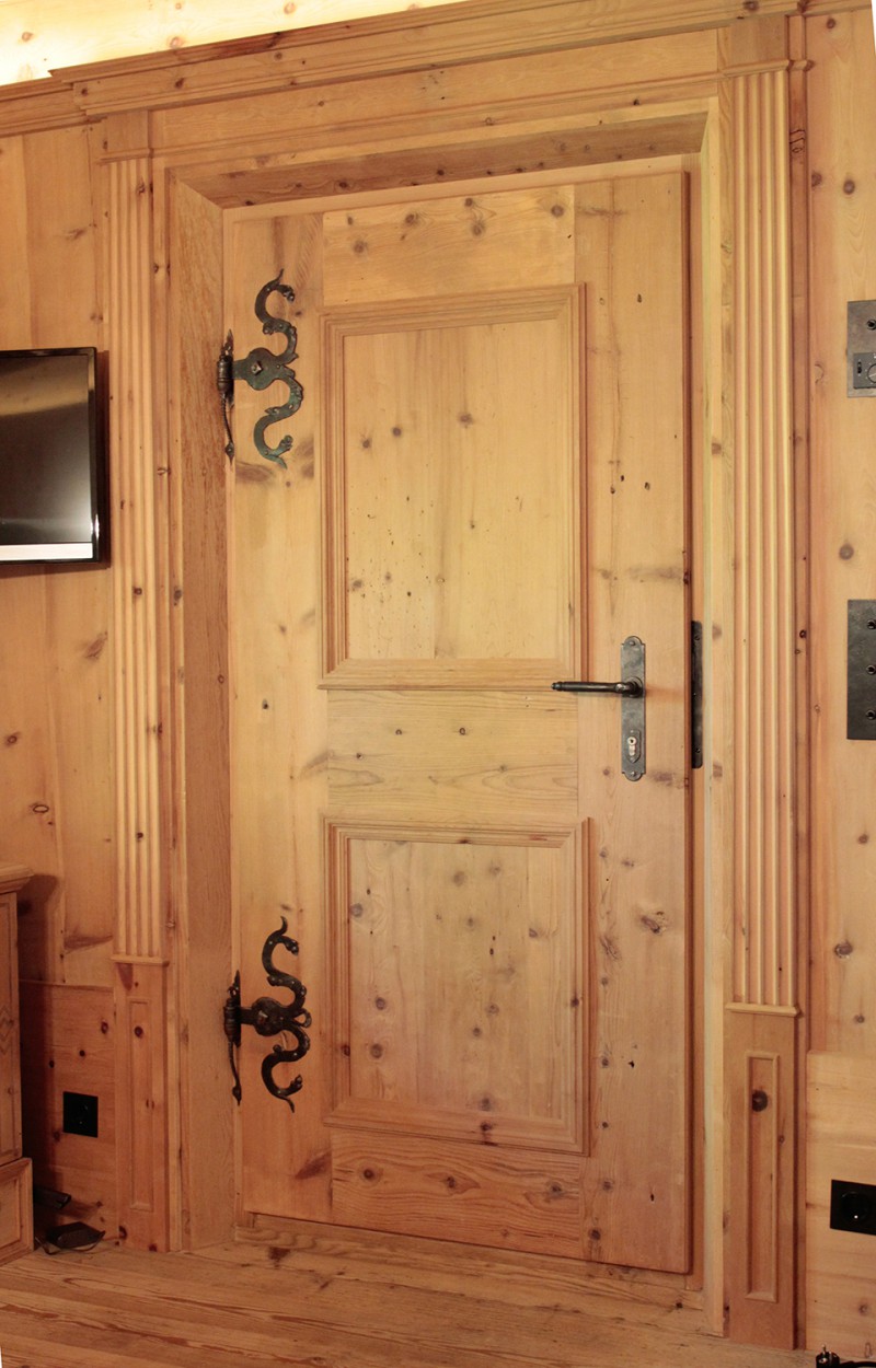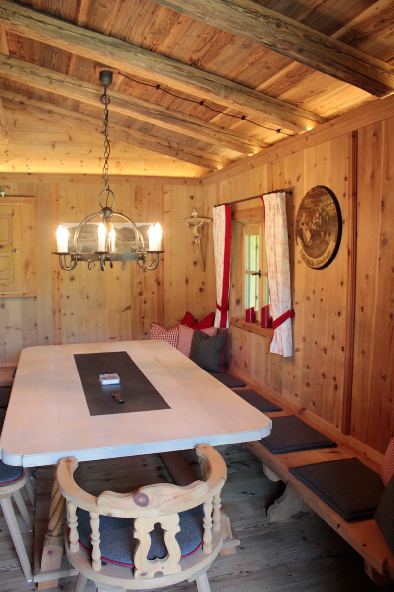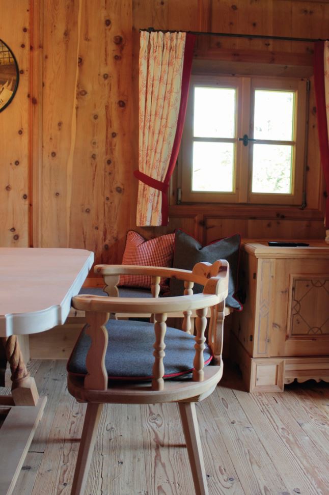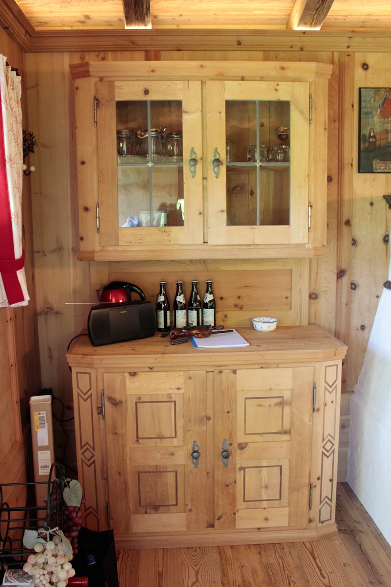 An den Sichtdachstuhl schließt die Täfelung aus gewaschenem Zirben-Altholz an. Ausgeführt als glatte Täfelungsfelder geteilt durch profilierte Lisenen mit Abschlussgesims. Ein Schnapskastl mit schlichter Einlegearbeit und altem Beschläge durfte nicht fehlen. Auch für die Kredenz mit Bleiverglasung und für die Aufdopplung der Eingangstür wurde Original handgeschmiedetes Beschläge verwendet. Ebenso für eine Truhe die als Stauraum dient.