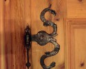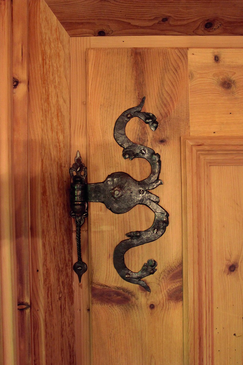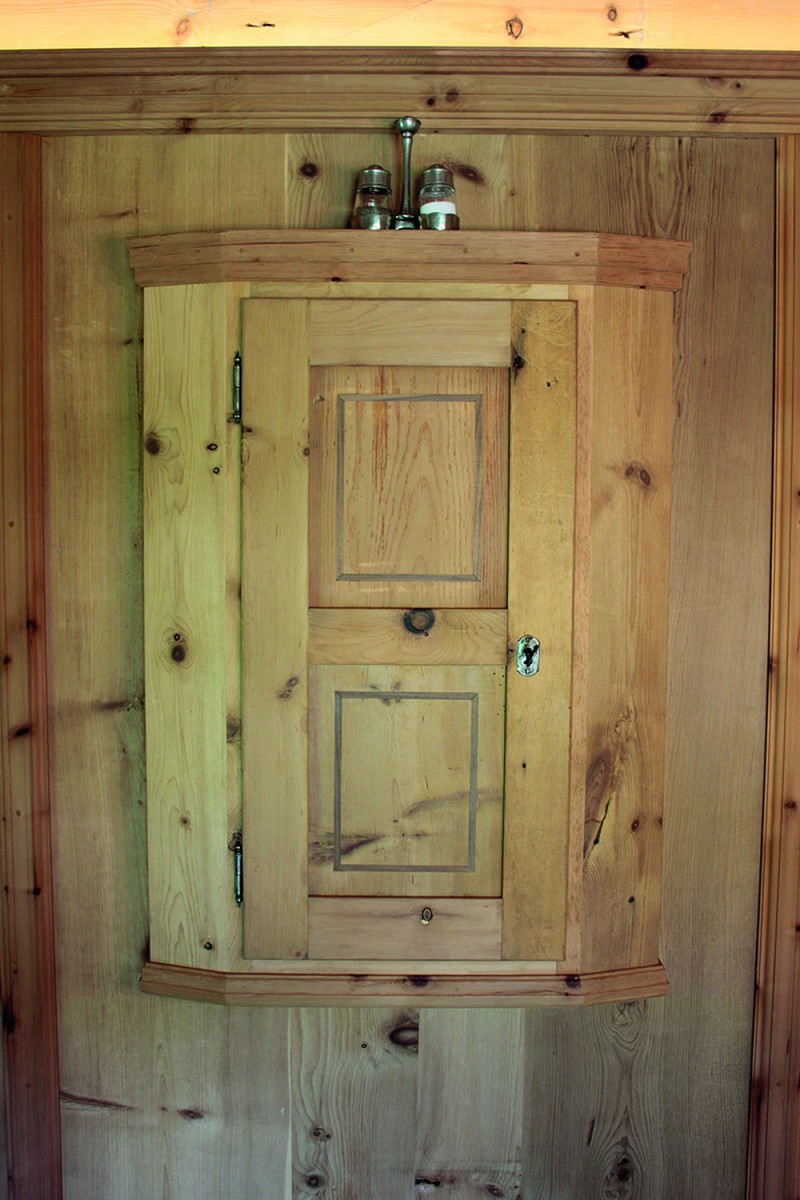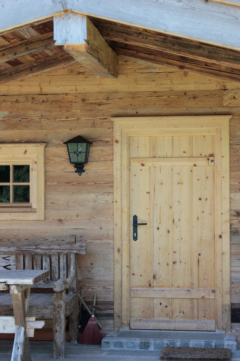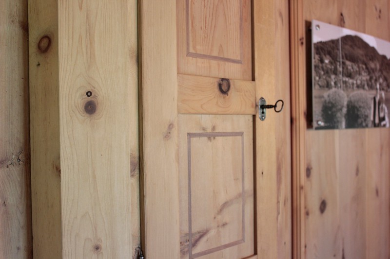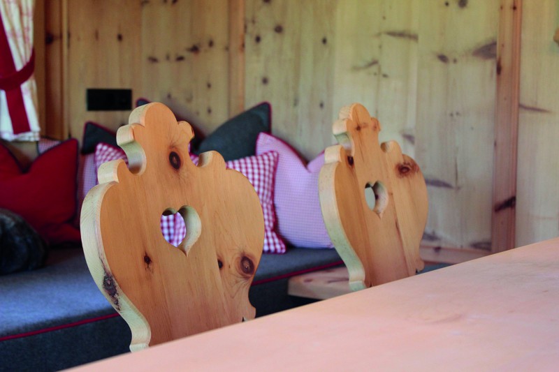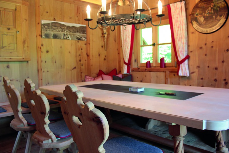 An den Sichtdachstuhl schließt die Täfelung aus gewaschenem Zirben-Altholz an. Ausgeführt als glatte Täfelungsfelder geteilt durch profilierte Lisenen mit Abschlussgesims. Ein Schnapskastl mit schlichter Einlegearbeit und altem Beschläge durfte nicht fehlen. Auch für die Kredenz mit Bleiverglasung und für die Aufdopplung der Eingangstür wurde Original handgeschmiedetes Beschläge verwendet. Ebenso für eine Truhe die als Stauraum dient.