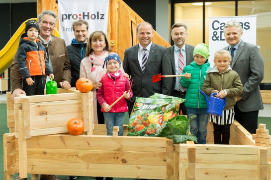 Die Hochbeete wurden nun vom für die Forst- und Holzwirtschaft zuständigen Regierungsmitglied LHStv. ÖR Josef Geisler und Bildungslandesrätin Beate Palfrader sowie dem proHolz Vorsitzenden Karl Schafferer an die begeisterten Kinder des Pfarr-Caritas-Kindergarten übergeben.