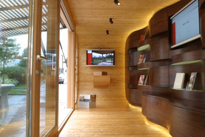 Das ‚Designerstück’ – kurz ‚H.o.T.’ zeigt an sich schon die Möglichkeiten des Einsatzes von Holz und ist ein Beispiel, wie gut verschiedene Holzarten untereinander und auch mit anderen Materialien harmonieren, sowie die Flexiblität von Holzbauten.