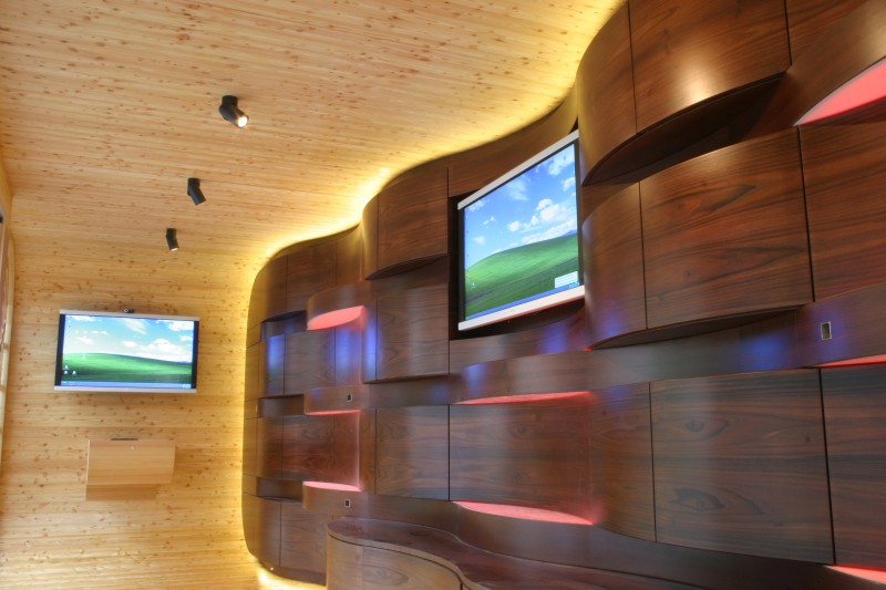 Die Wände und Decken sind aus Brettsperrholz in Lärche gefertigt und bei Decke, Boden und Wänden sichtbar belassen. Alle sichtbaren Teile sind geölt. Die Korpuse der Schrankwand sind aus Ahorn, die Fronten wurden in gedämpfter Akazie ausgeführt.
