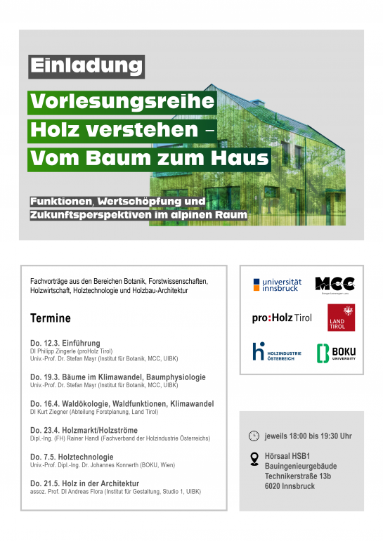 proHolz Tirol ist Partner im Mountain Competence Center der Universität Innsbruck, das Institutionen mit Alpenraum-Bezug vernetzt, um eine nachhaltige Entwicklung zu fördern.