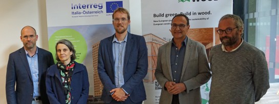 Bild 1: v.l.: Vortragende und Organisatoren des Workshops: Dr. Sebastian Rüter (Thünen-Institut für Holzforschung in Hamburg), Prof. Dr. Ing. Annette Hafner (Ruhr-Universität Bochum, Lehrstuhl für Ressourceneffizientes Bauen), DI Philipp Zingerle (proHolz Tirol), DI Kurt Ziegner (Land Tirol, Gruppe Forst), Univ.-Prof. DI Dr. Wolfgang Streicher (Universität Innsbruck, Arbeitsbereich Energieeffizientes Bauen)