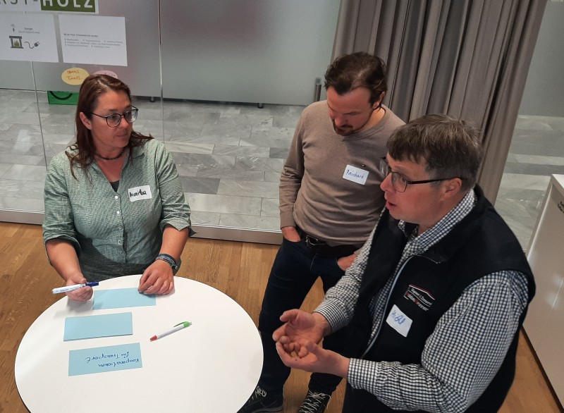 Die Teilnehmer*innen diskutierten, was wertgerechte Holznutzung für sie bedeutet und wo es aus ihrer Sicht aktuell Verbesserungspotenziale gibt. Gemeinsam wurden Ideen gesammelt, wie Holz zukünftig noch wertgerechter verwendet werden könnte. Dabei ging es vor allem um Nischenmärkte und um Holz für spezielle Anwendungen oder mit besonderen Merkmalen.