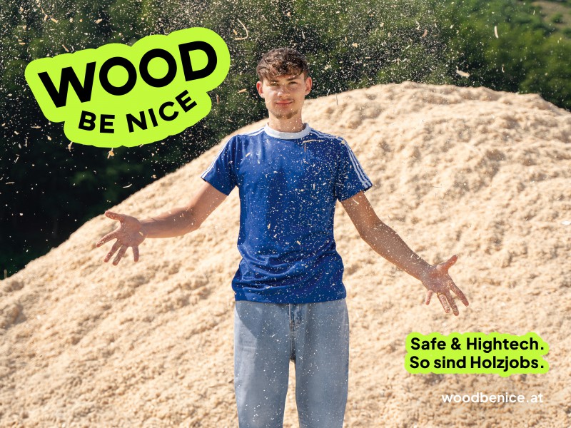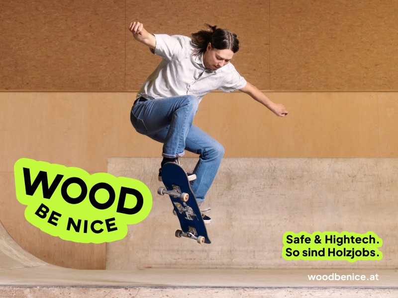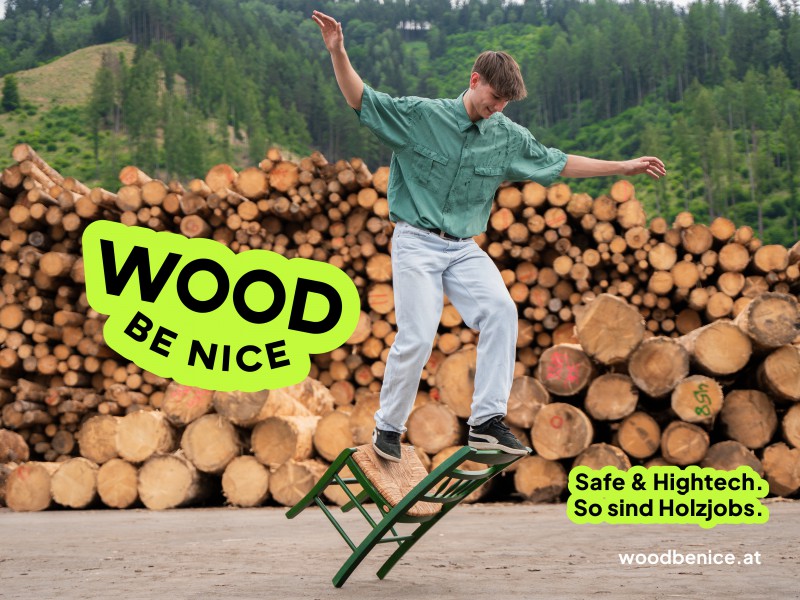 Die Kampagne „Wood be nice“, die proHolz Austria gemeinsam mit der Linzer Agentur „Gruppe am Park“ entwickelt hat und für die Branche umsetzt, spricht junge Menschen als Nachwuchskräfte für die Holzwirtschaft an. Kurzvideos werfen überraschende Blicke auf die Arbeitswelt Holz und greifen zentrale Werte der Generation Z wie Naturverbundenheit, Sicherheit, Technologieoffenheit und Selbstbestimmtheit – Werte, denen die Holzwirtschaft optimal entspricht – auf.