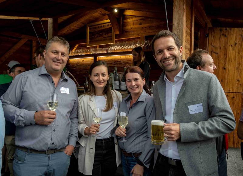 Bild 5: V. l.: Hausherr Mathias Bischofer, Anna Schnegg (proHolz Tirol), Hausherrin Silvia Bischofer sowie Simon Holzknecht (Clustermanager und stv. Geschäftsführer von proHolz Tirol) freuten sich über die gute Stimmung beim Sommerfest.