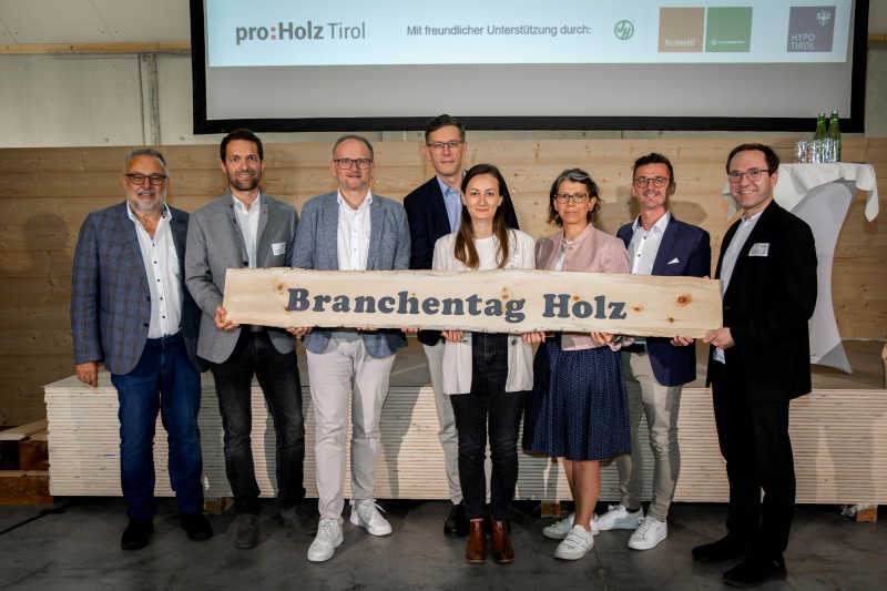 Bild 2: Die Gastgeber freuen sich mit den Vortragenden über einen gelungenen Nachmittag. V. l.: Manfred Saurer (Vorstandsvorsitzender proHolz Tirol), Simon Holzknecht (proHolz Tirol), Johannes Oberdanner (Pfeier Group), Albert Rössler (ADLER-Werk Lackfabrik), Anna-Maria Schnegg (proHolz Tirol), Veronika Auer (EGGER Group), Christian Tippelreither (Weitzer Woodsolutions) und Alexander Petutschnigg (FH Salzburg)