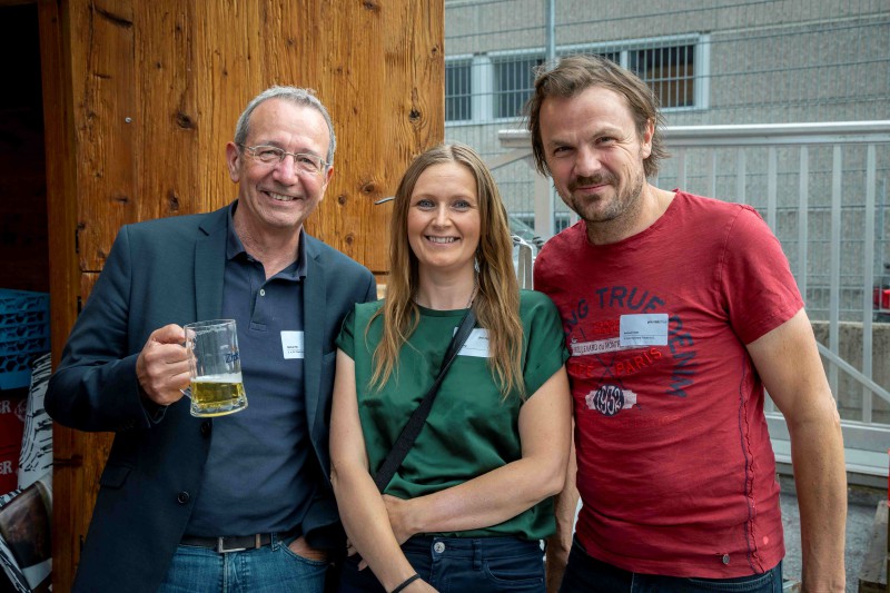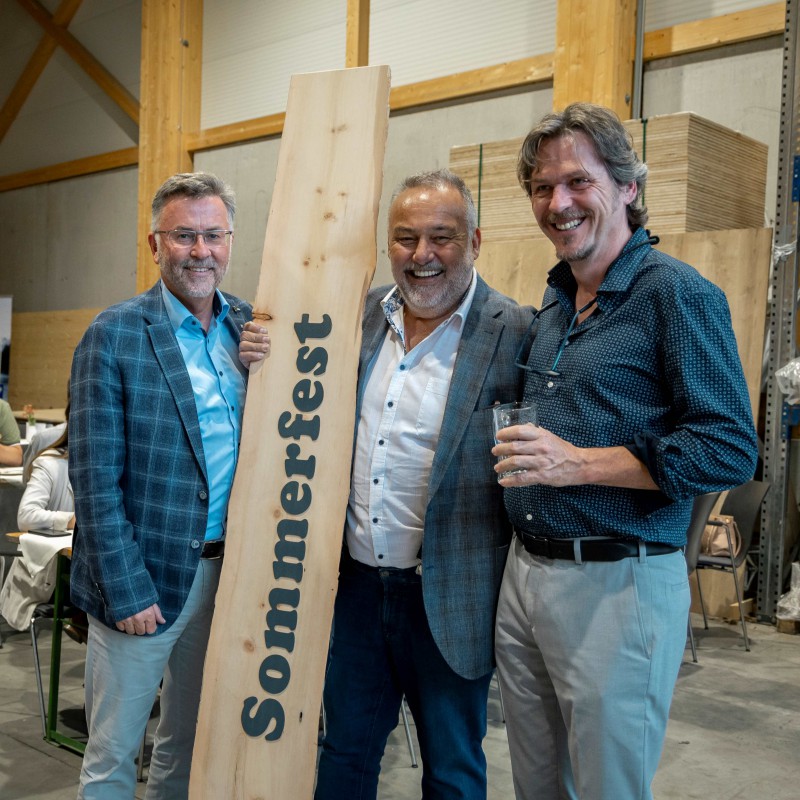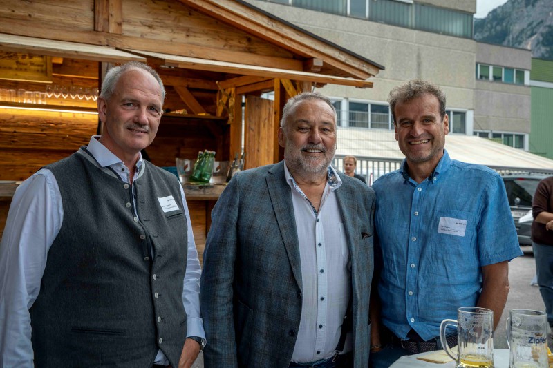 Bild 6: V. l.: Vorsitzende unter sich: Martin Lengauer-Stockner (Vorstandsvorsitzender htt15 – Holzbau Team Tirol), Manfred Saurer (Vorstandsvorsitzender proHolz Tirol) und Karl Schafferer (Ehrenvorsitzender von proHolz Tirol) genossen den lauen Sommerabend und fachsimpelten ausgiebig.