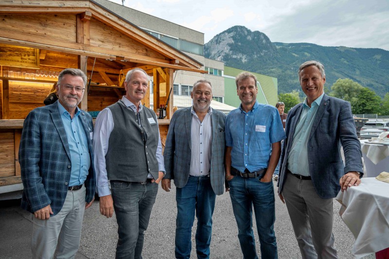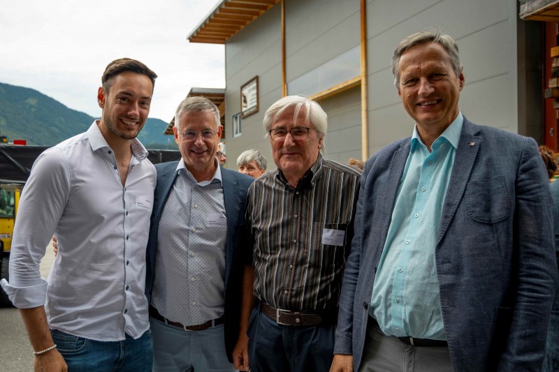 Bild 4: V. l.: Genossen das Sommerfest bei gutem Wetter: Rüdiger Lex (proHolz Tirol), Martin Lengauer-Stockner (Vorstandsvorsitzender htt15 – Holzbau Team Tirol), Manfred Saurer (Vorstandsvorsitzender proHolz Tirol), Karl Schafferer (Ehrenvorsitzender von proHolz Tirol) und Josef Fuchs (Landesforstdirektor)