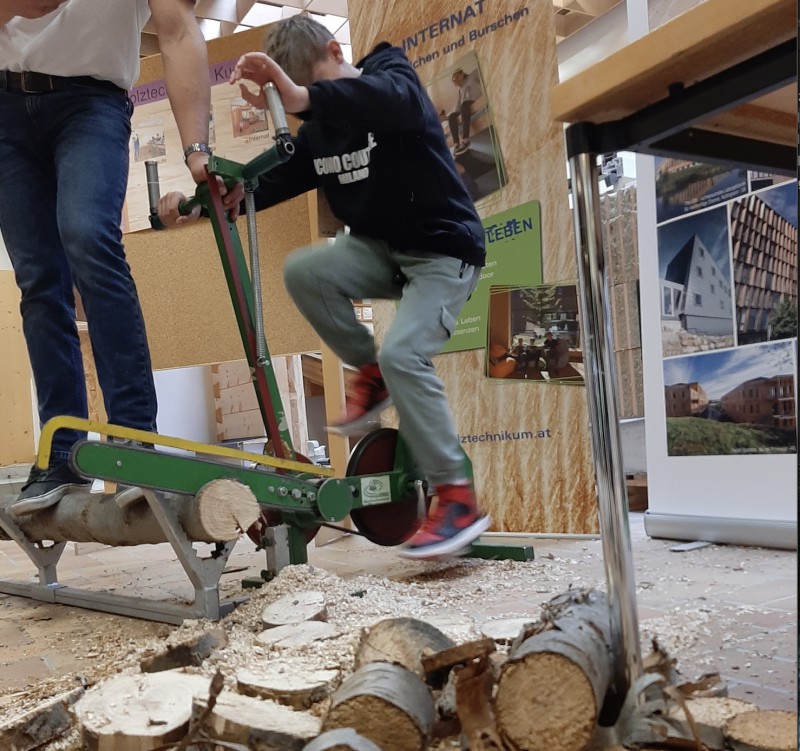 Ohne Schweiß kein Preis! Was in der Holzindustrie maschinell erledigt werden kann, benötigt beim „Genialen Holztag“ Muskelkraft der Schüler*innen.