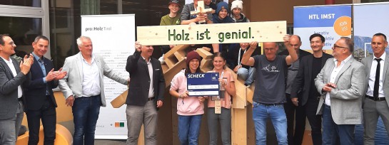 Schnell war der Ehrgeiz bei den Jugendlichen geweckt. Am Ende des Tages konnten sich die Klassen 3b und 3c der Mittelschule Prutz-Ried über den ersten Platz freuen. Das Preisgeld in Höhe von 300 Euro wurde von den proHolz Tirol-Vorstandsmitgliedern Manfred Saurer und Kurt Ziegner, Landesinnungsmeister Holzbau Simon Kathrein und Landesinnungsmeister-Stellvertreter der Tischler Christian Pienz überreicht. Ebenfalls zufrieden mit ihren Leistungen war die Klasse 3b der Mittelschule Reutte Untermarkt mit dem 2. Platz und einem Preisgeld von 200 Euro. 100 Euro erhielt die Klasse 3b der Mittelschule Sölden für den 3. Platz. Die Gewinne werden in der Klassenkasse für den nächsten Schulausflug gespart. Die Hypo Tirol Bank hat den „Genialen Holztag“ unterstützt und war mit Martin Staudacher vor Ort vertreten.