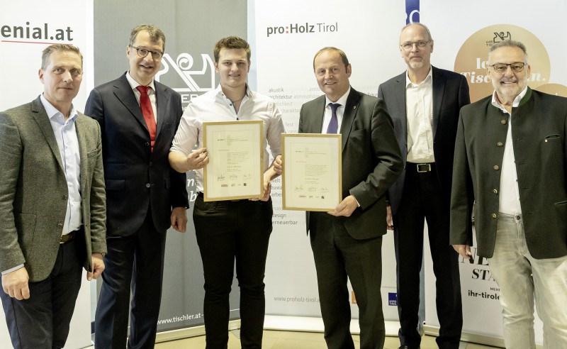 (v. l.) Franz Jirka (Spartenobmann Gewerbe und Handwerk WK Tirol), Martin Wetscher (Vizepräsident der WK Tirol), der mit einer Auszeichnung in der Kategorie Tischlereitechnik bedachte Andreas Radinger, LHStv. Josef Geisler, Klaus Buchauer (Landesinnungsmeister der Tischler und Holzgestalter), Manfred Saurer (Vorstandsvorsitzender von proHolz Tirol)