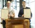 Thomas Brantner (l.) schloss die Tischlerlehre im zweiten Bildungsweg ab und wurde mit einer Auszeichnung für sein Abschlussprojekt belohnt. Rechts im Bild sein Ausbildner Marco Holzknecht.