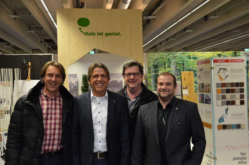Bild 5 (v.l.): assoz. Prof. DI Dr. Anton Kraler (Holzbaulehrstuhl), Bernhard Schiffthaler (Adler-Werk Lackfabrik Johann Berghofer GmbH & Co KG), Thomas Knapp (Holzfenster – natürlich aus Tirol), Florian Reimeir (Schafferer Holzbau GmbH)