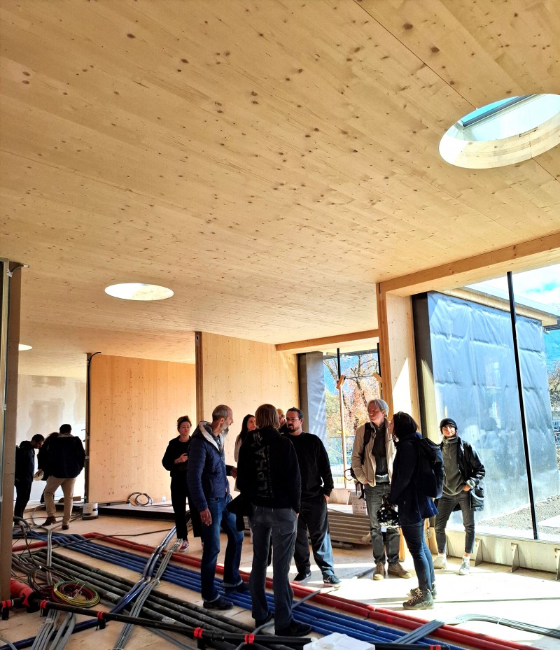 Martin Rauchenbacher (2.v.l.), Vertreter der ausführenden Firma Scherer Holzbau, führte die Teilnehmer*innen durch die Baustelle am RAIQA-Quartier.