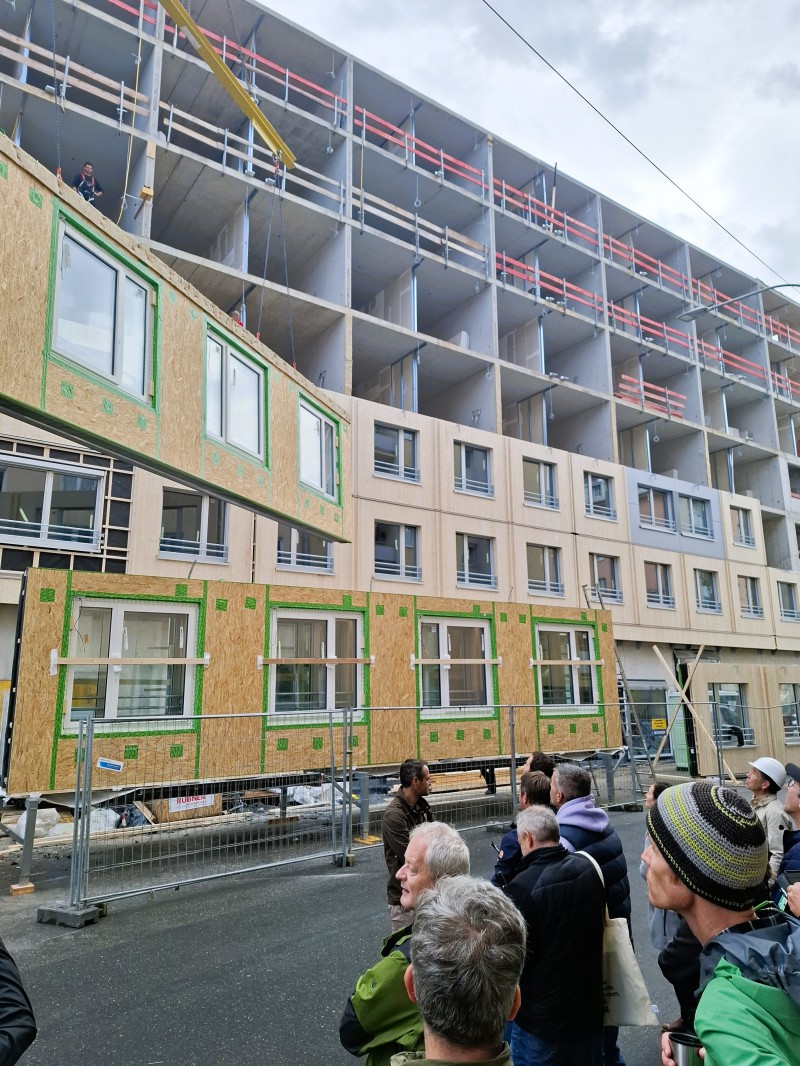 Am RAIQA-Quartier führte Martin Rauchenbacher von Scherer Holzbau durch die Baustelle. Das Projekt, entwickelt in Zusammenarbeit mit der Universität Innsbruck, setzt die moderne Holzmodulbauweise ein und zeigt die Flexibilität des Materials im städtischen Kontext.