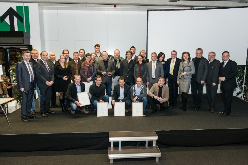 Bild 1: Gruppenbild mit den Preisträgern, die Auszeichnungen entgegennehmen konnten, sowie Veranstalter, Ehrengäste und Juroren.