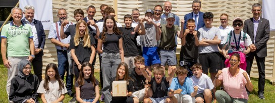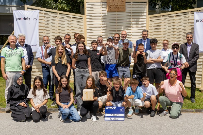 Bild 5: Die Gewinner der Holzolympiade 2024: Die 3c der Mittelschule Schulzentrum Hall i.T. erhielt einen Scheck über Euro 300,-- für die Klassenkasse.