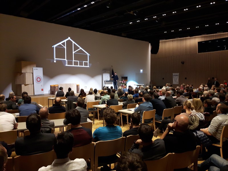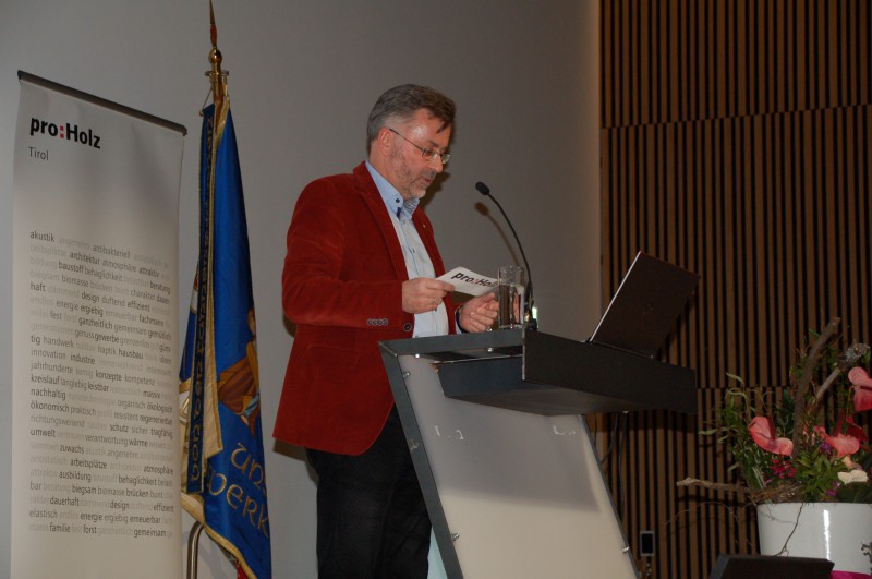 Das heuer mit über 250 Zuhörern wieder besonders zahlreich erschienene Publikum sorgte für einen vollen Saal und lauschte nach einführenden Worten durch die proHolz-Verantwortlichen Karl Schafferer und Rüdiger Lex aufmerksam den Ausführungen des erfahrenen und höchst unterhaltsamen Referenten Architekt und Zimmermann Univ.-Prof. Dipl. Ing. Flori-an Nagler aus München.