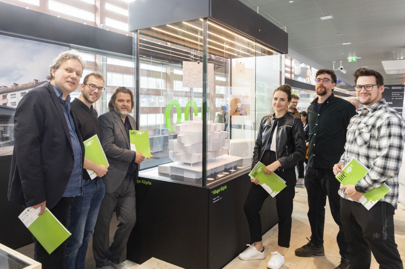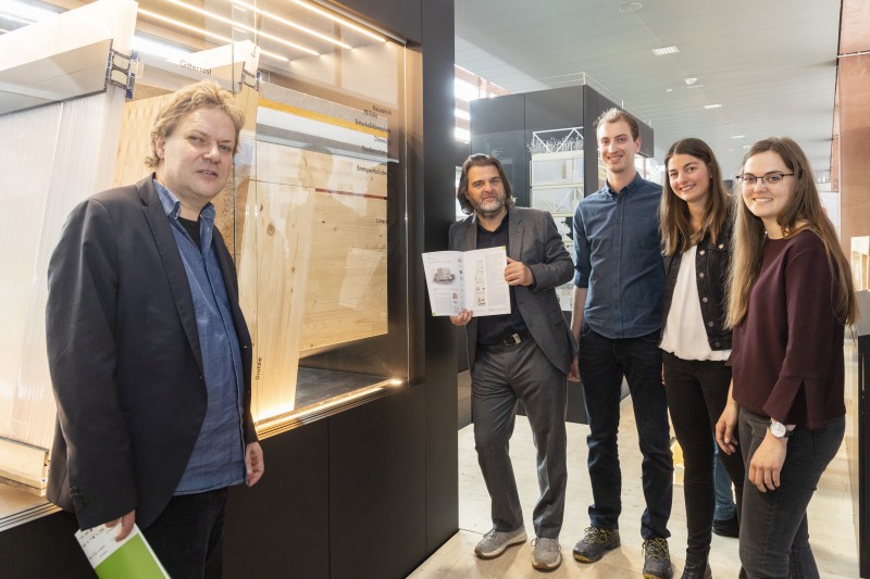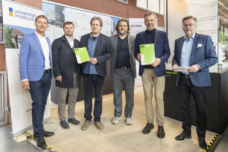 Die Projektverantwortlichen des Wettbewerbs Lift up mit Innsbrucks Bürgermeister Georg Willi (2.v.r). V.l.: Karl-Heinz Eppacher (Dach+Fach GmbH), DI Dr. techn. Roland Maderebner (Universität Innsbruck/Institut für Konstruktion und Materialwissenschaften), assoz. Prof. DI Andreas Flora (Universität Innsbruck/Gestaltung1), Arch. DI Thomas Thaler (SPhii_architectural collaboration) und Rüdiger Lex (proHolz Tirol)